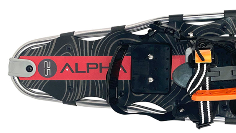 The Alpha models are built with a durable polyethylene deck material for extra strength and rebound in cold weather. The deck is attached to the frame with suspension straps which add some cushion when hiking on ice or hard snow. The tip and tail bumpers add some protection to the snowshoe frame when breaking a trail through the woods.