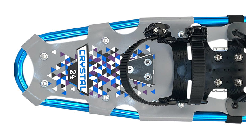 The Crystal snowshoes are constructed with a one-piece aircraft aluminum frame. This model has been designed with lighter weight tubing using the highest grade 6063 alloy. The beautiful anodized frame colors glow in the snow and add a little sparkle to your winter adventures. The Crystal has a rockered profile for maneuverability.